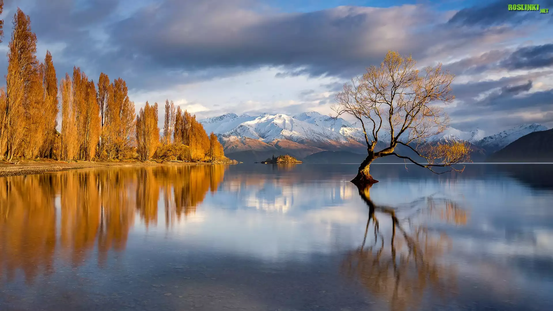 Rośliny: Jezioro Wanaka, Drzewo, Góry, Jesień, Chmury, Nowa Zelandia