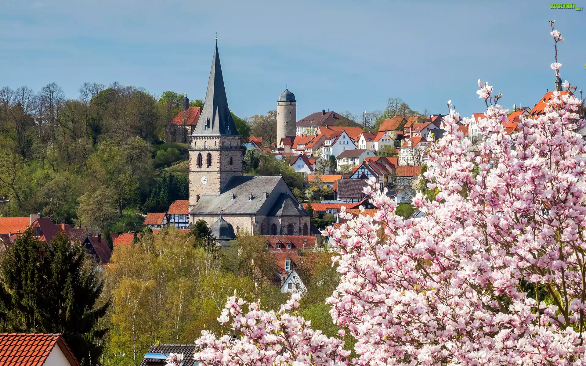 Niemcy, Nadrenia Północna-Westfalia, Miasto Warburg, Kwitnąca, Magnolia, Kościół, Domy, Drzewa, Wiosna |