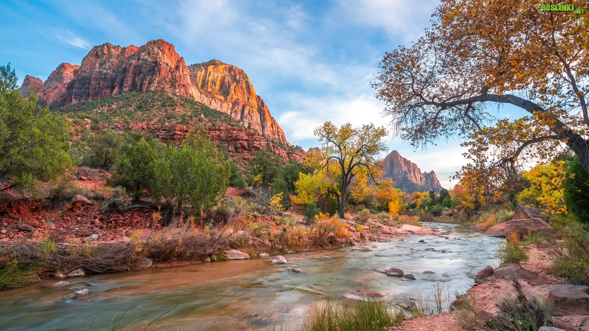 Park Narodowy Zion, Góry Watchman, Drzewa, Rzeka, Virgin River, Kamienie, Stan Utah, Stany Zjednoczone |