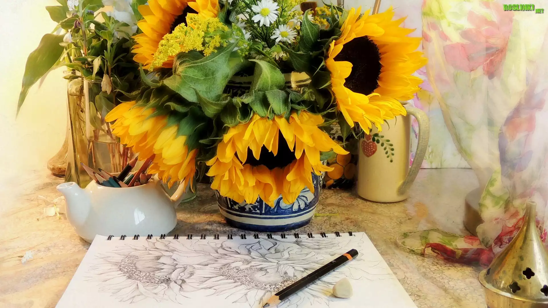 Rośliny: Wazon, Słoneczniki, Kwiaty, Notes, Ołówek, Stół