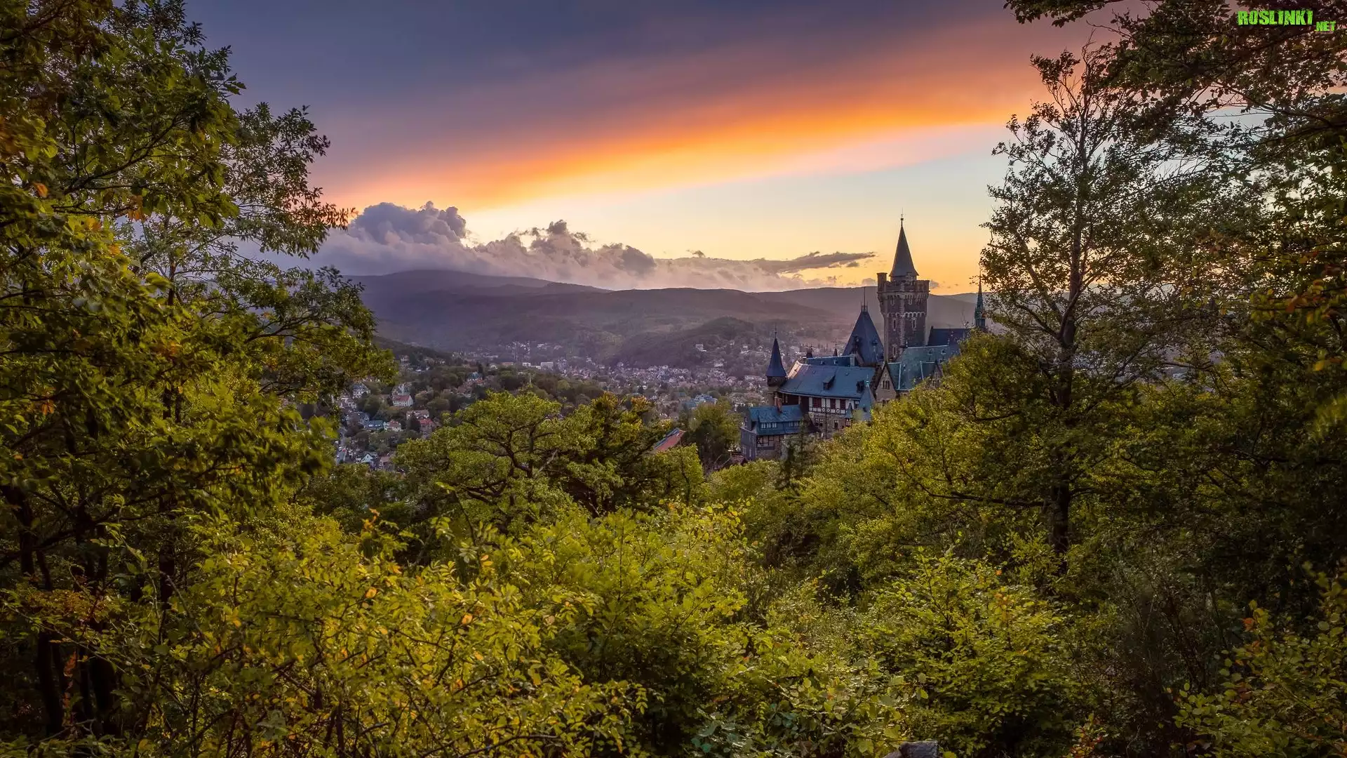 Rośliny: Wzgórza, Zamek Wernigerode, Drzewa, Zachód słońca, Chmury, Wernigerode, Powiat Harz, Niemcy