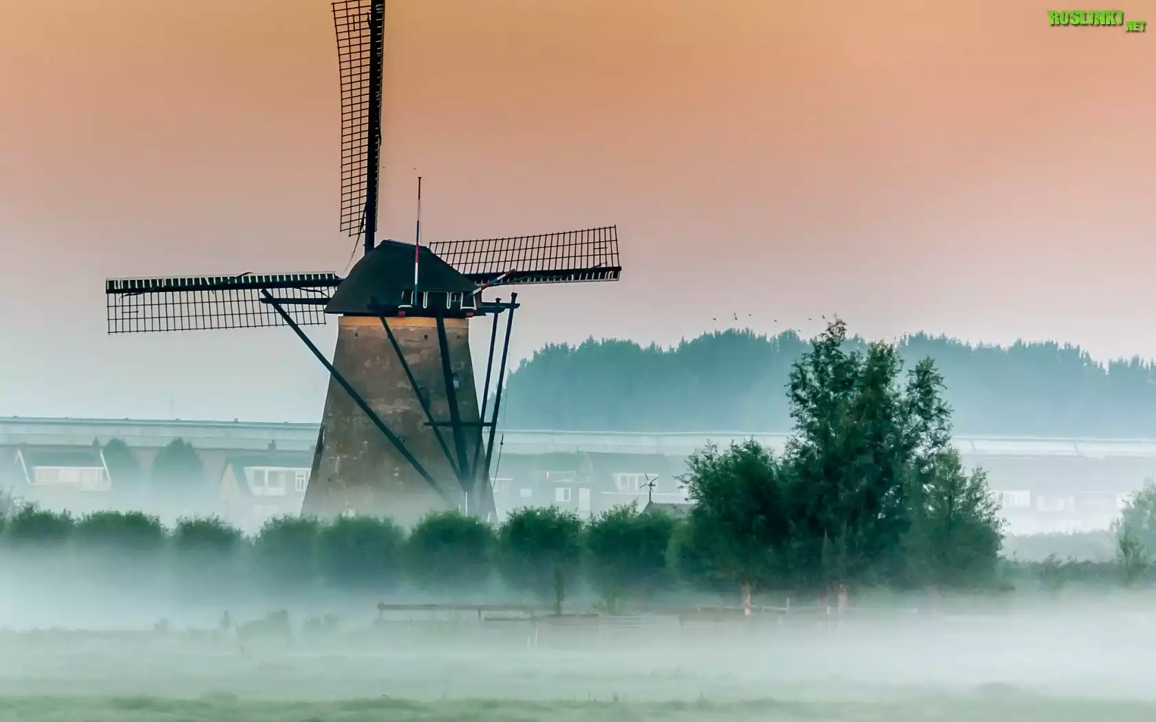 Rośliny: Wiatrak, Mgła, Drzewa, Świt