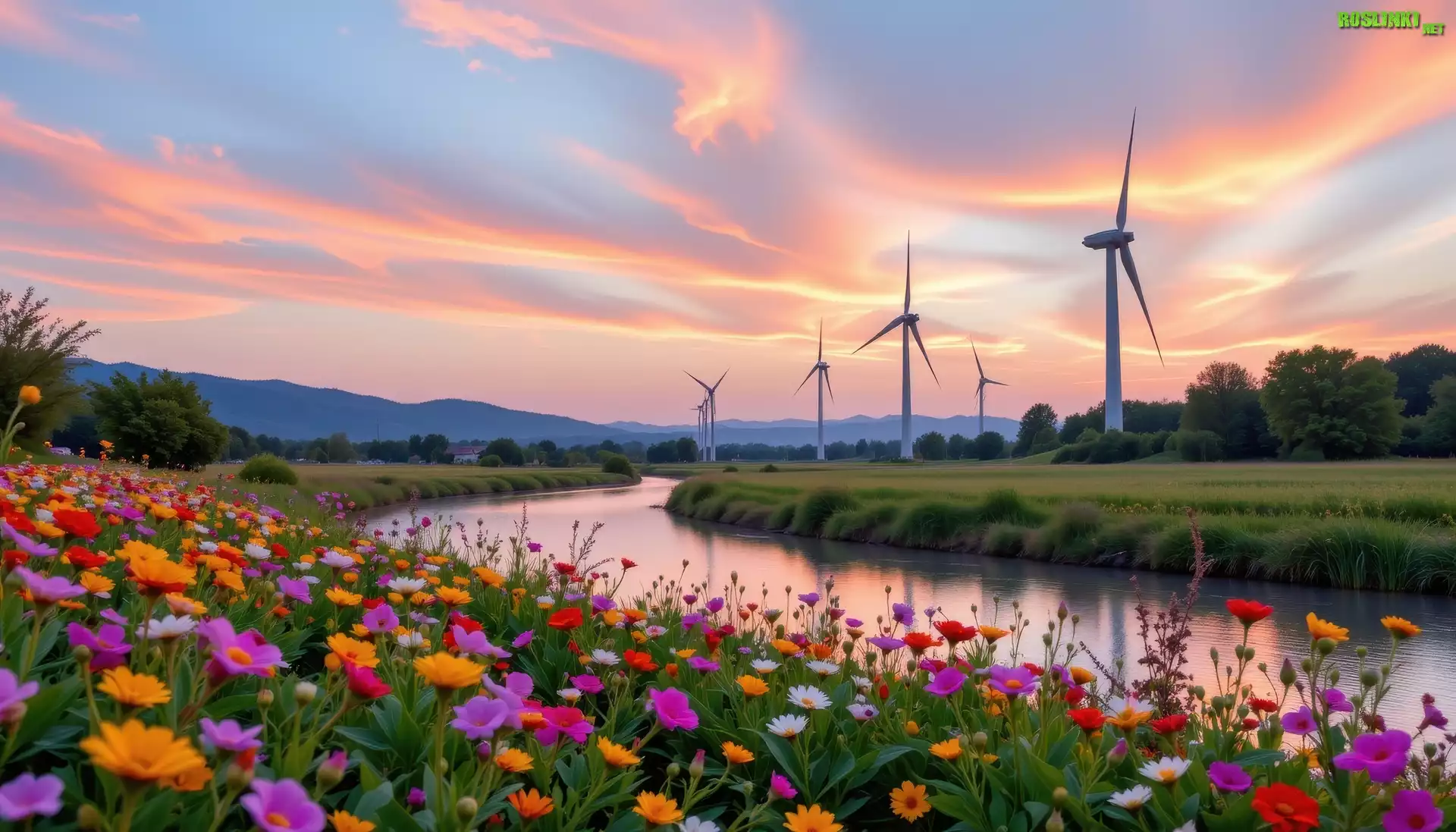 Rośliny: Rzeka, Łąka, Kwiaty, Wiatraki, Drzewa, Grafika AI
