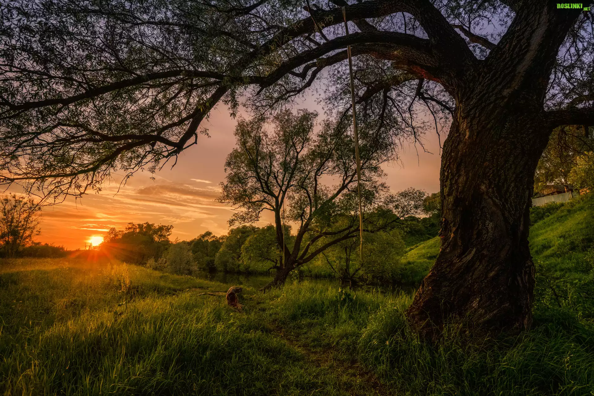 Rośliny: Rosja, Czechow, Zachód słońca, Łąki, Pagórki, Drzewa, Rzeka, Wieczór