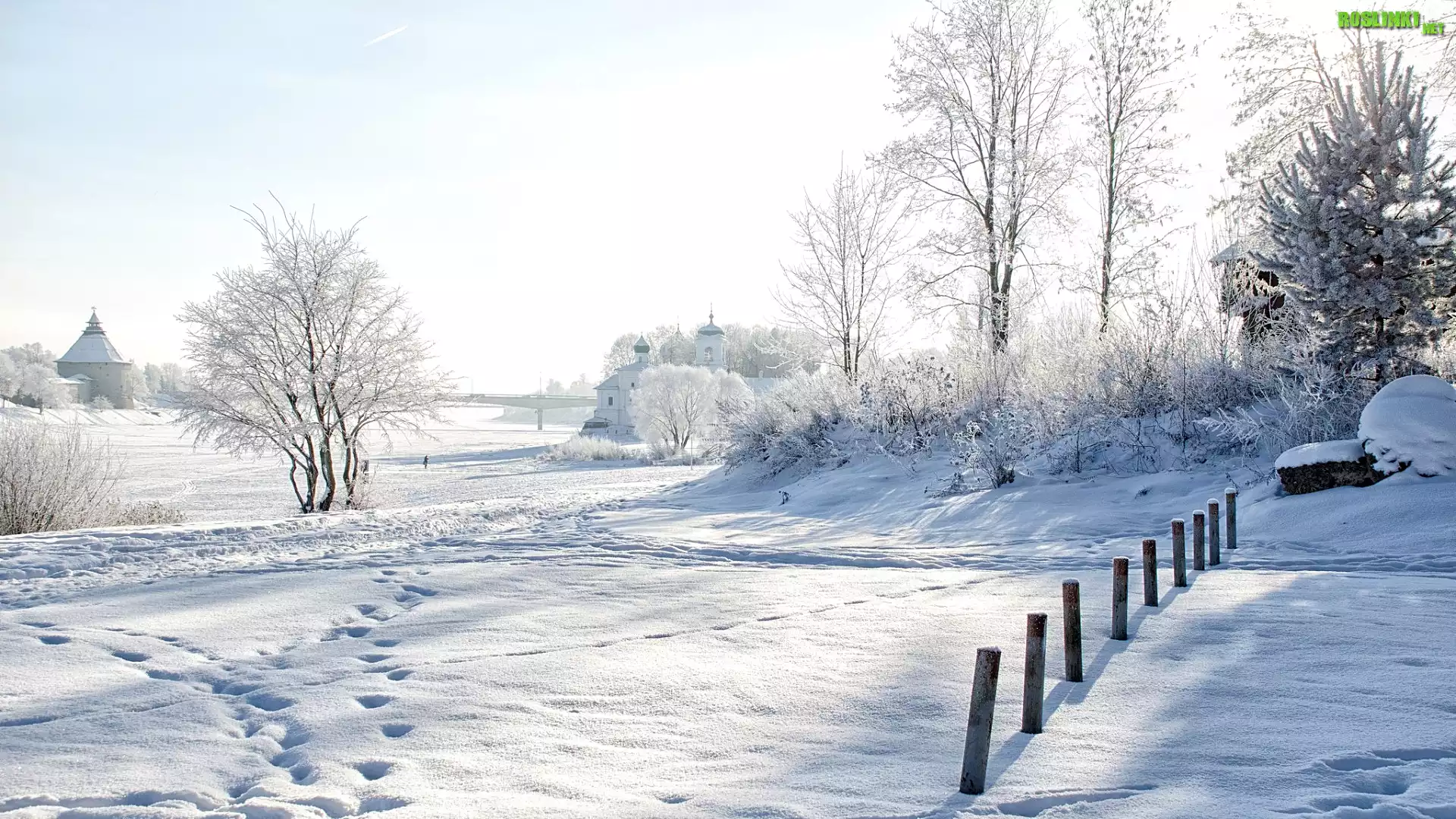 Rosja, Psków, Zaśnieżona, Rzeka Wielikaja, Zima, Miroski Monaster Przemienienia Pańskiego, Klasztor, Most, Drzewa, Słupki |