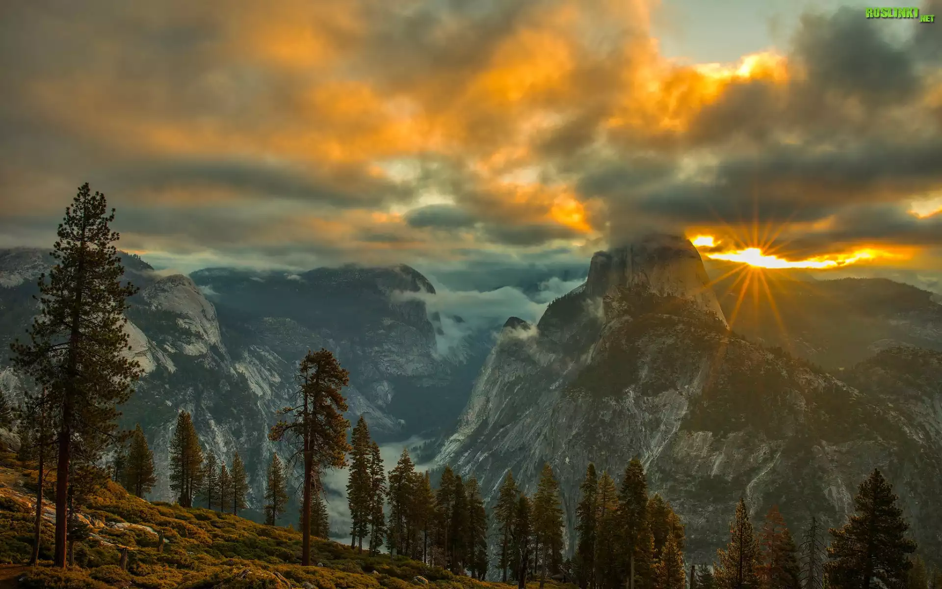 Park Narodowy Yosemite, Drzewa, Świerki, Niebo, Słońce, Promienie, Góry, Skały, Mgła, Kalifornia, Stany Zjednoczone |