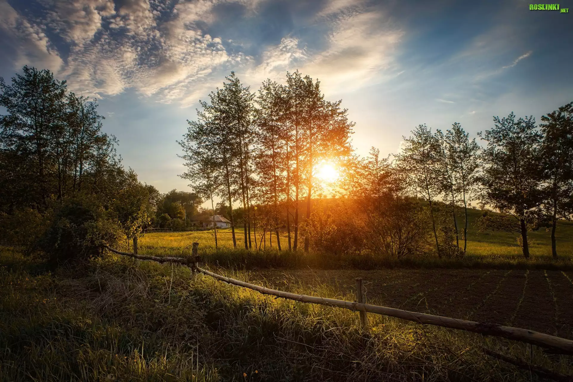 Rośliny: Łąka, Drzewa, Roślinność, Wschód słońca, Chmury, Domek, Wieś