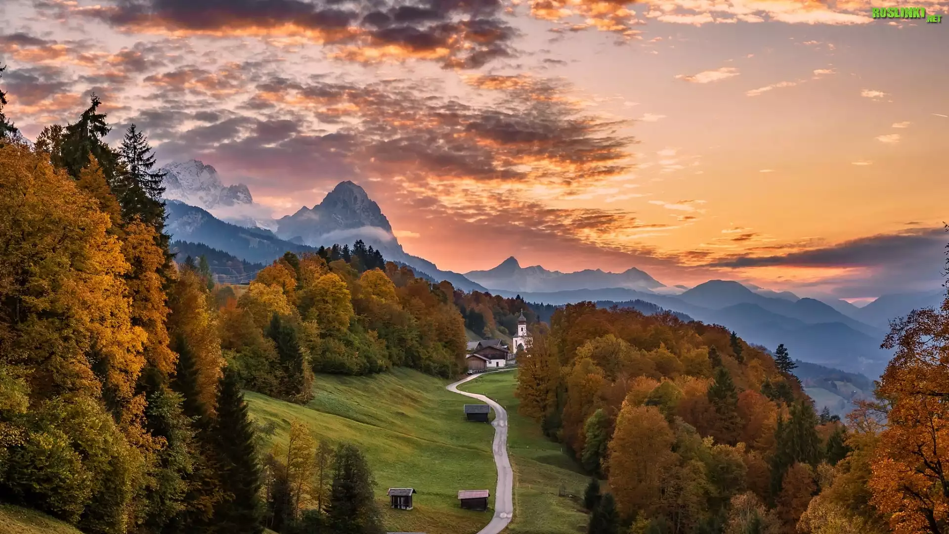 Rośliny: Niemcy, Bawaria, Wieś Wamberg, Góry, Wzgórza, Droga, Kościół św. Anny, Drzewa