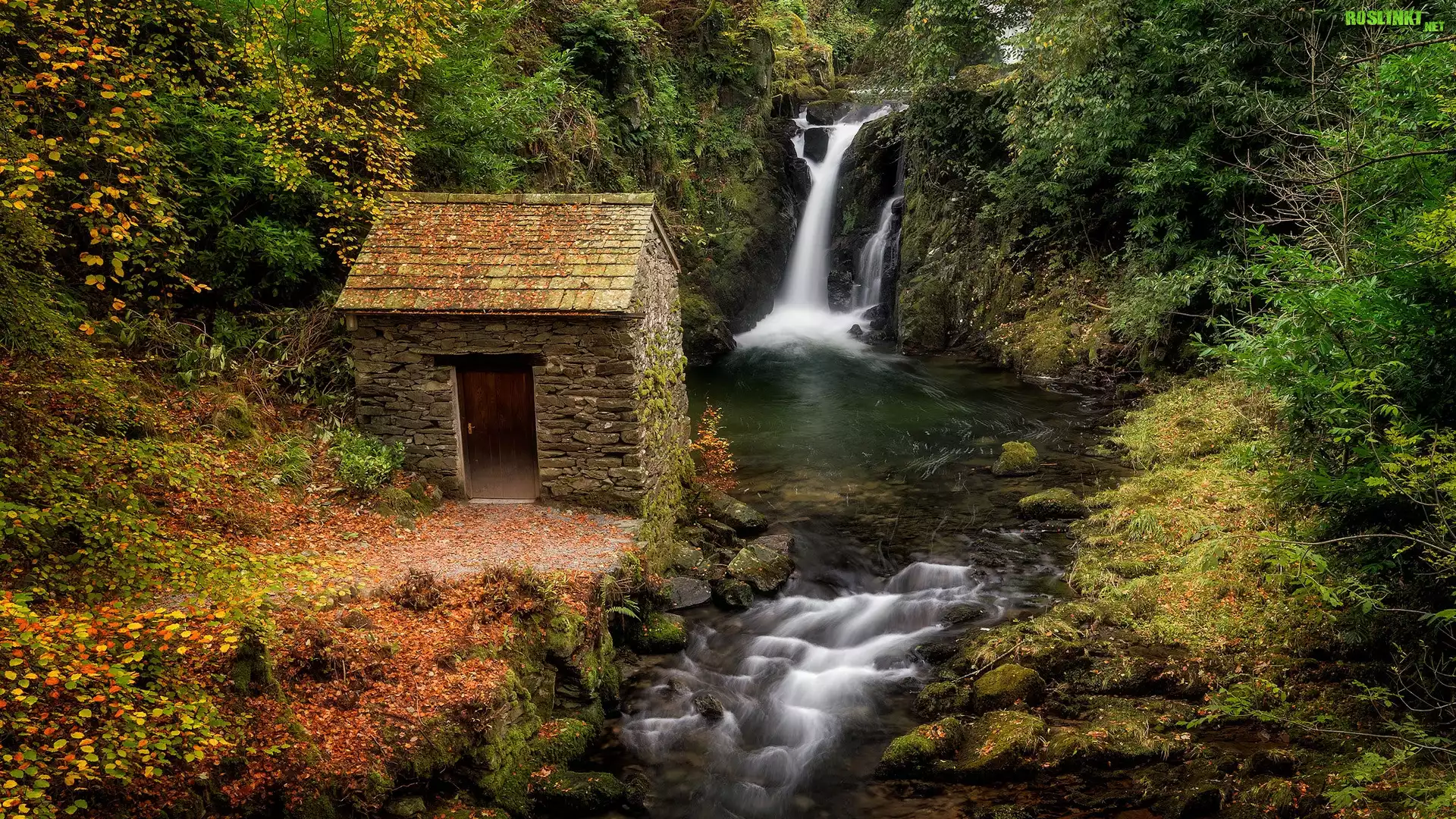 Jesień, Drzewa, Las, Rzeka, Wodospad, Wieś Rydal, Dom widokowy, Hrabstwo Kumbria, Anglia