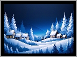 Zima, Drzewa, Åšnieg, WieÅ›, Domy, Noc, Grafika