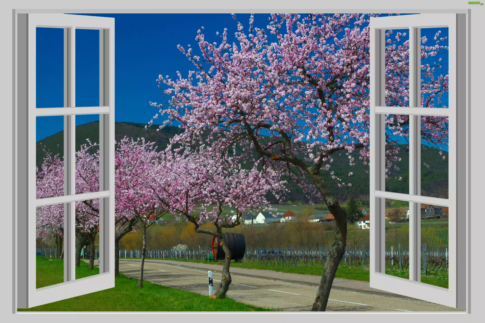 Rośliny: Wiosna, Okno, Droga, Drzewa, Wieś