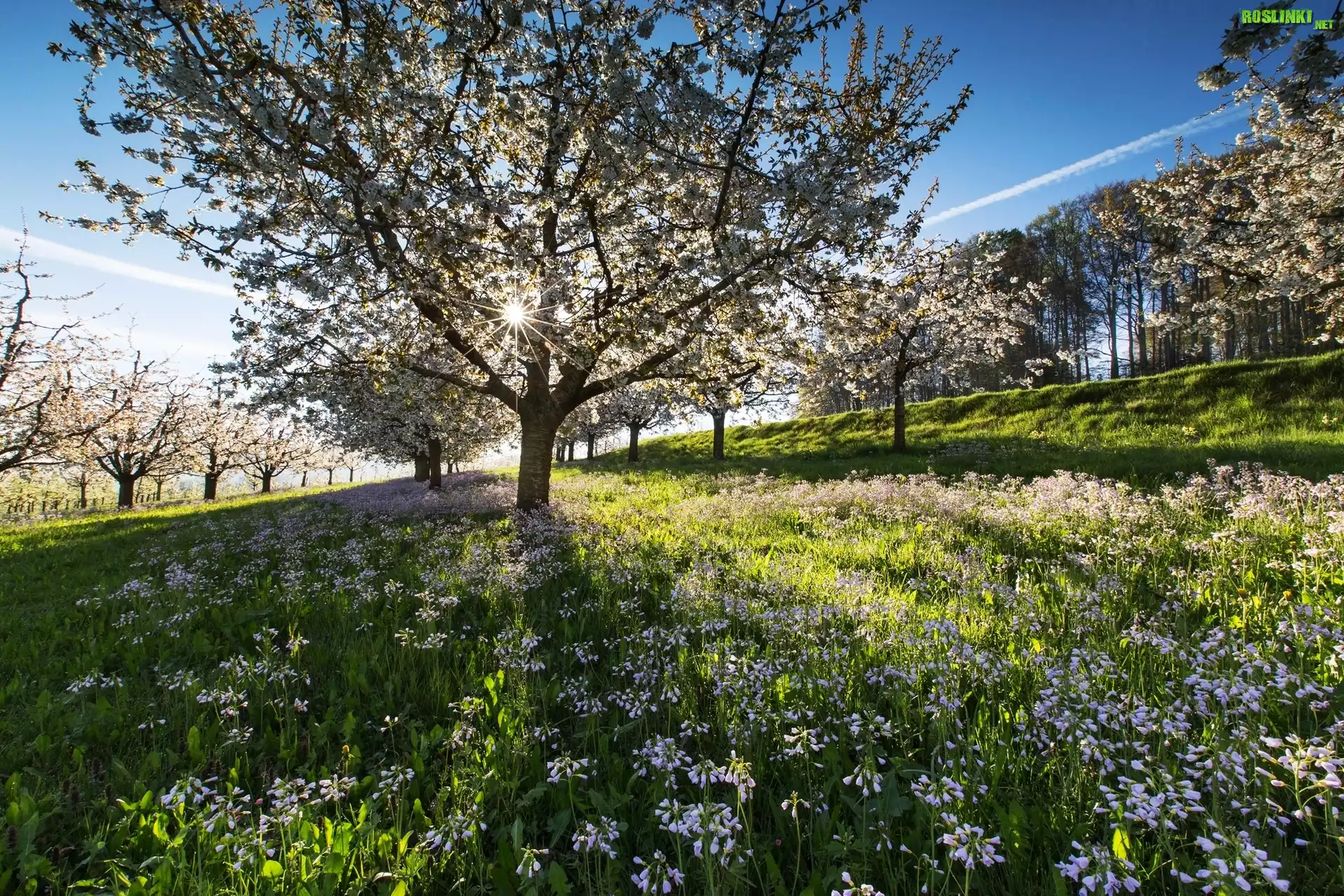 Rośliny: Wiosna, Sad, Kwitnące, Drzewa, Promienie słońca