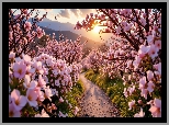 Wiosna, Kwitnące, Drzewa, Gałązki, Różowe, Kwiaty, Ścieżka, Zachód słońca