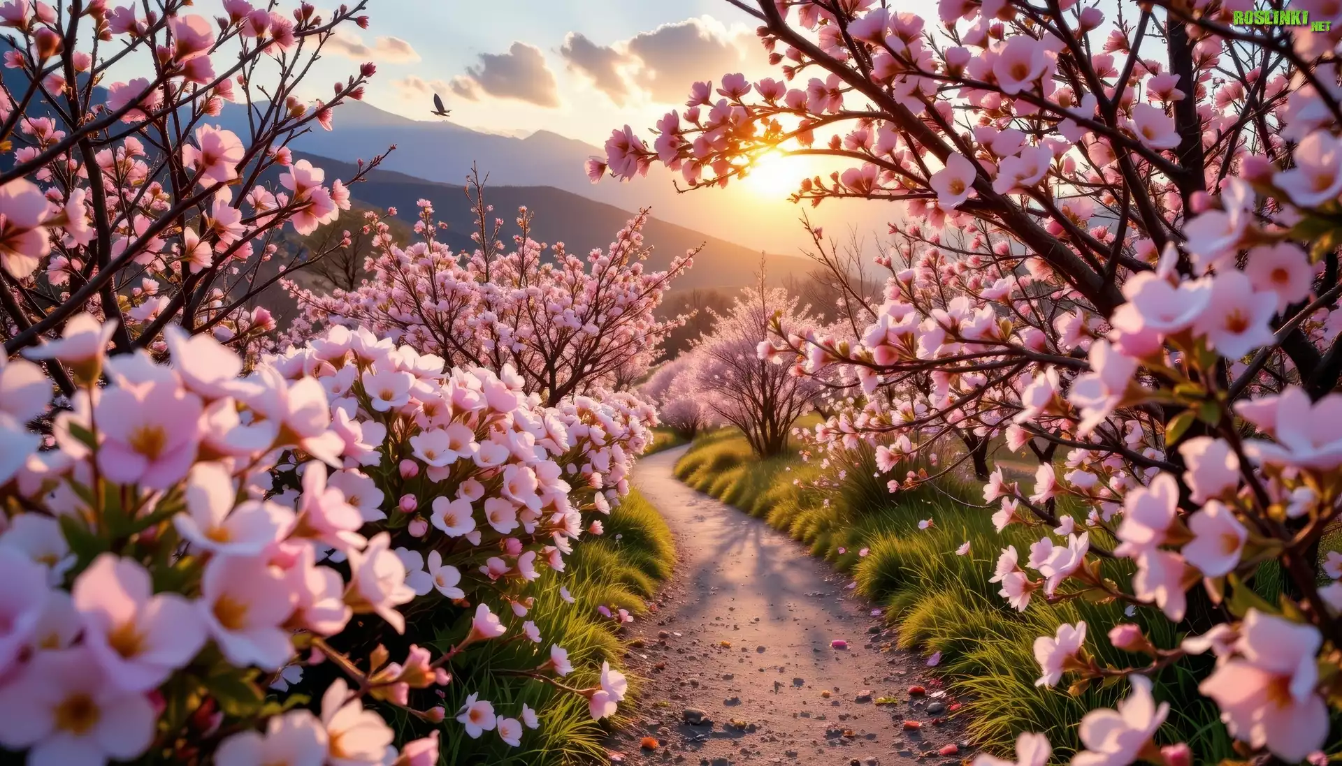 Rośliny: Wiosna, Kwitnące, Drzewa, Gałązki, Różowe, Kwiaty, Ścieżka, Zachód słońca