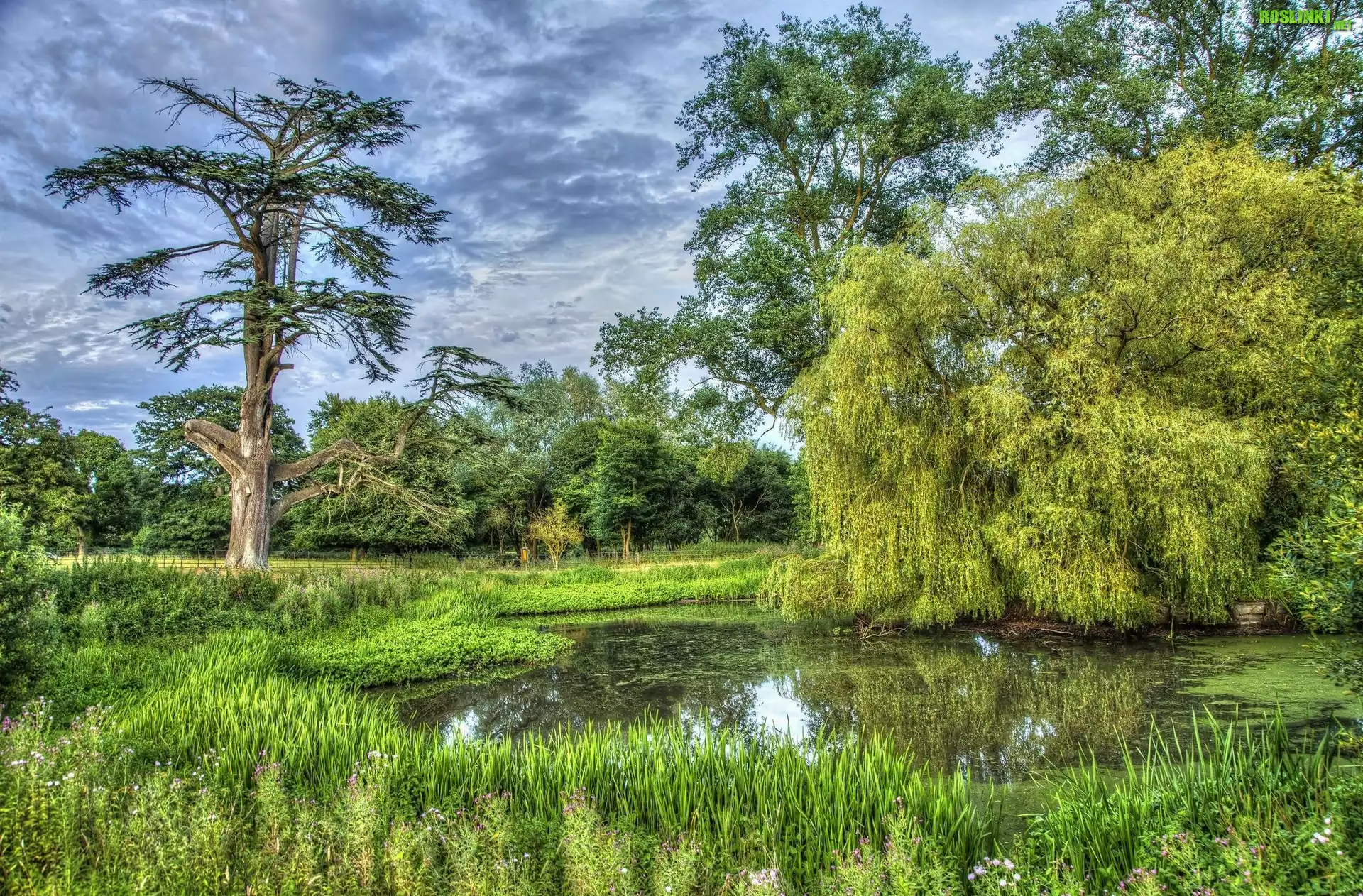 Wiosna, Staw, Drzewa, Wierzba, Trawa