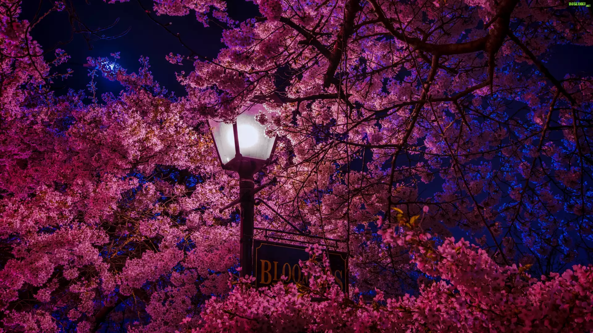 Rośliny: Drzewo, Wiśna, Kwitnąca, Noc, Niebo, Latarnia, Światło