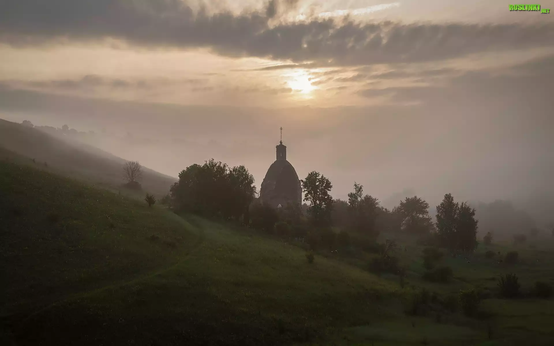 Rośliny: Poranek, Świt, Wschód słońca, Mgła, Kaplica, Drzewa