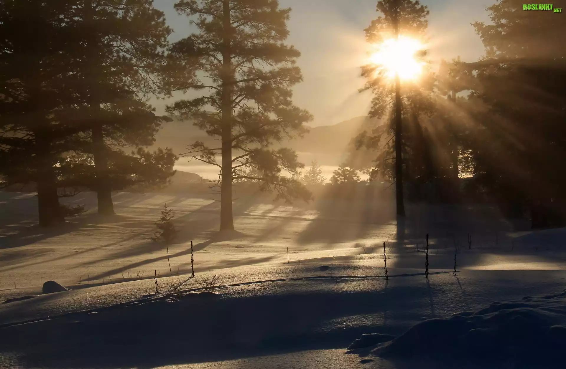 Rośliny: Zima, Świt, Słońce, Drzewa, Mgła, Promienie słońca
