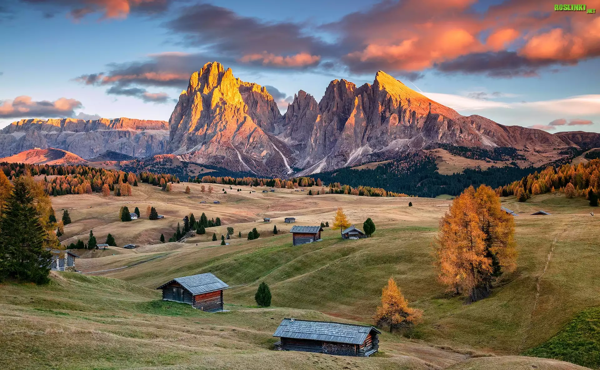 Włochy, Płaskowyż Seiser Alm, Dolina Val Gardena, Góry Sassolungo, Dolomity, Domy, Drzewa, Chmury |