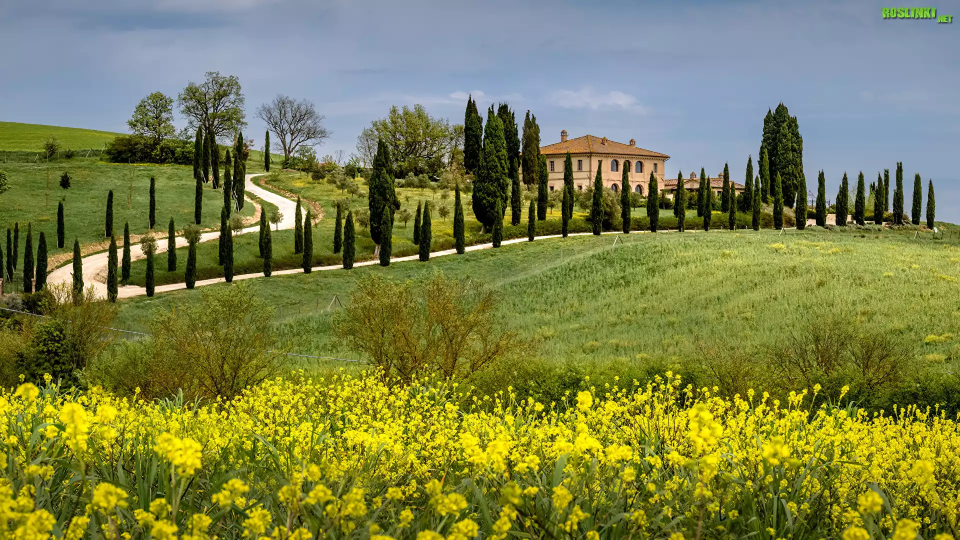 Rośliny: Włochy, Toskania, Wzgórze, Drogi, Dom, Drzewa, Cyprysy, Pola, Łąka