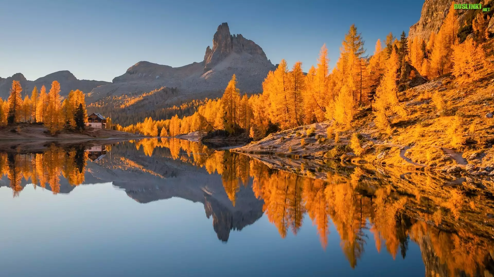 Rośliny: Włochy, Belluno, Góry, Dolomity, Jezioro, Lago Federa, Jesień, Drzewa, Modrzewie