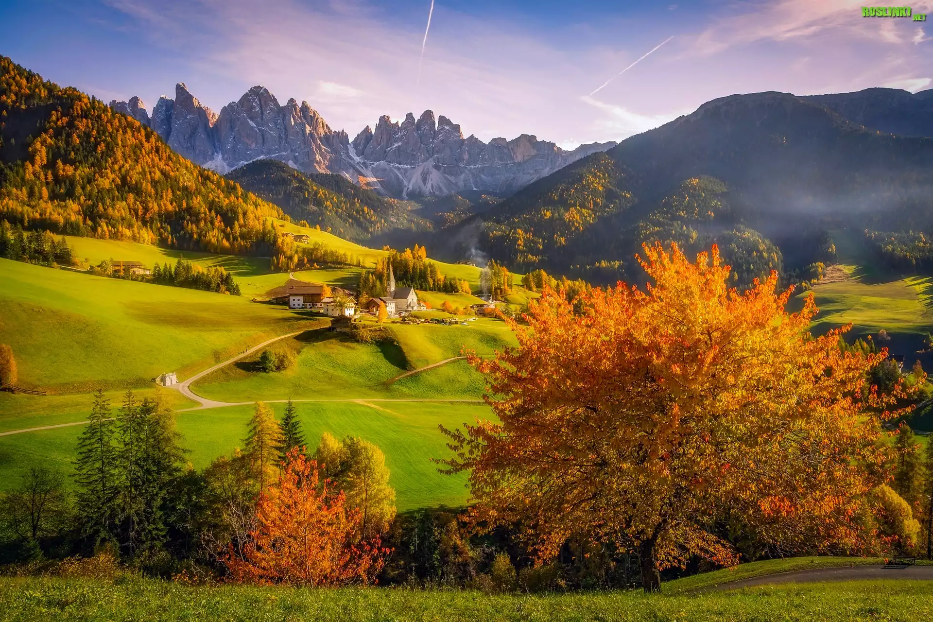 Włochy, Dolomity, Dolina Val di Funes, Wieś Santa Maddalena, Góry, Masyw Odle, Jesień, Lasy, Drzewa, Domy, Kościół |