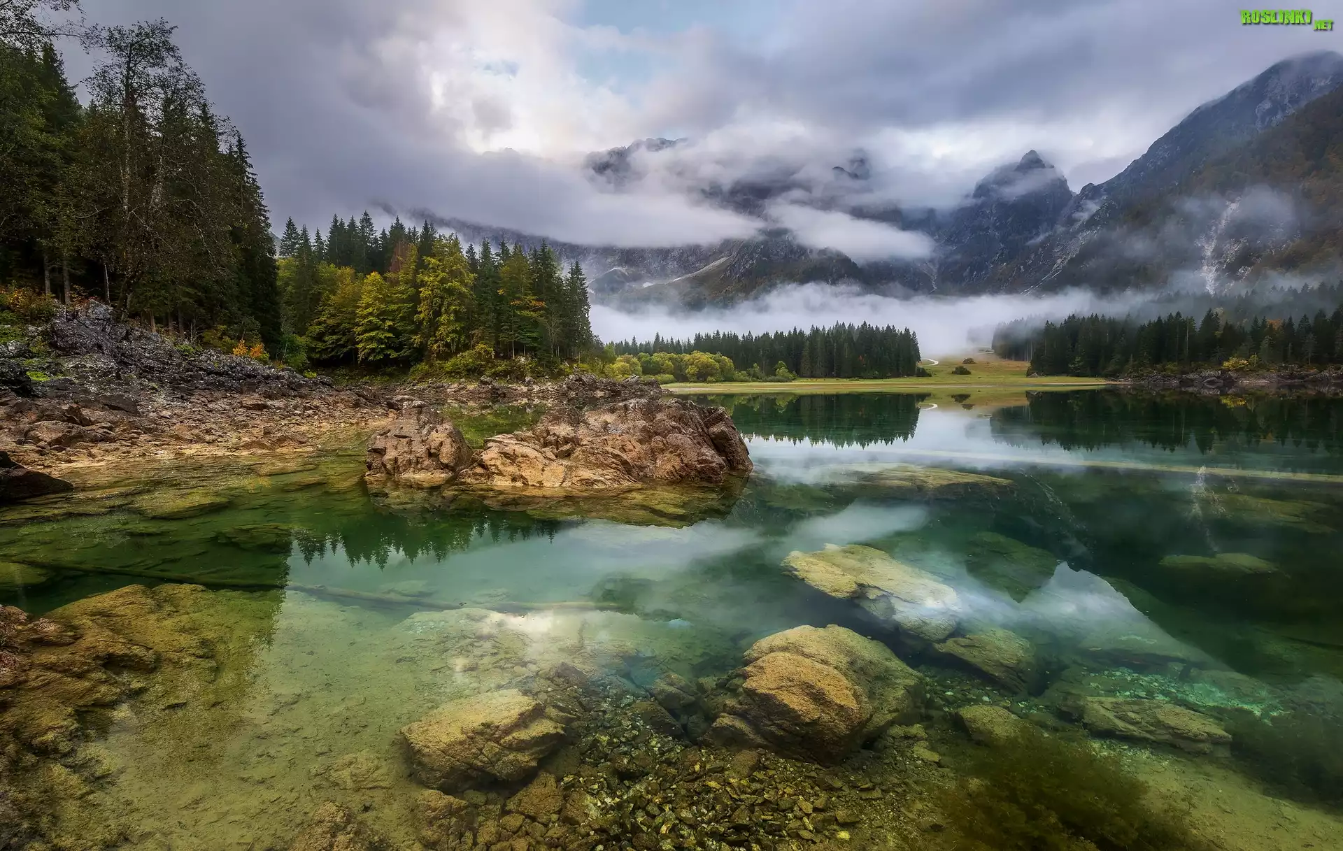 Rośliny: Jezioro Fusine Lake, Góry, Alpy Julijskie, Skały, Drzewa, Włochy