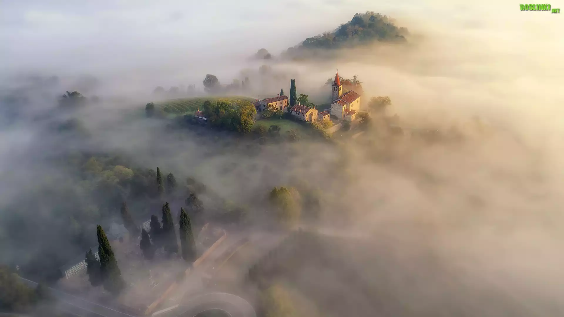 Rośliny: Włochy, Toskania, Mgła, Domy, Wzgórza, Drzewa