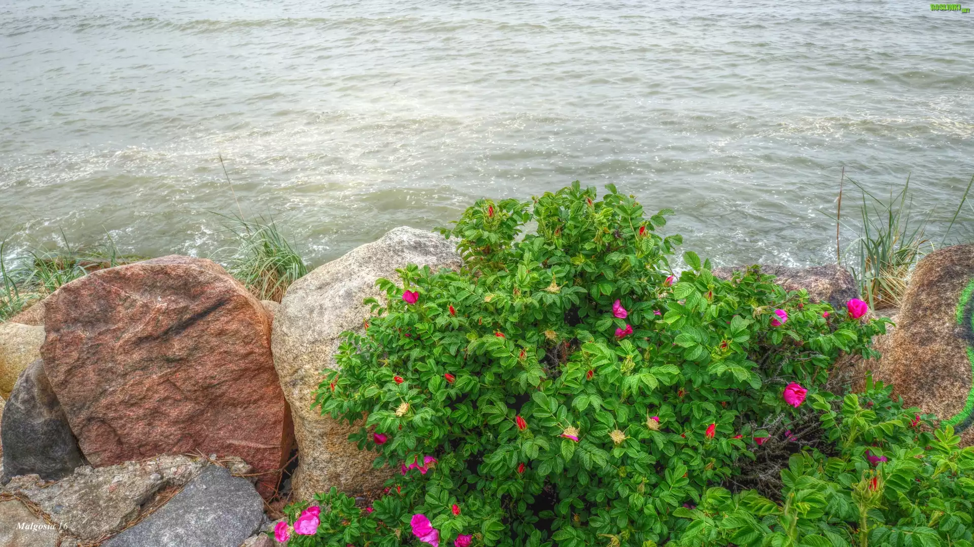 Morze, Woda, Kamienie, Roślina, Dzika Róża, HDR