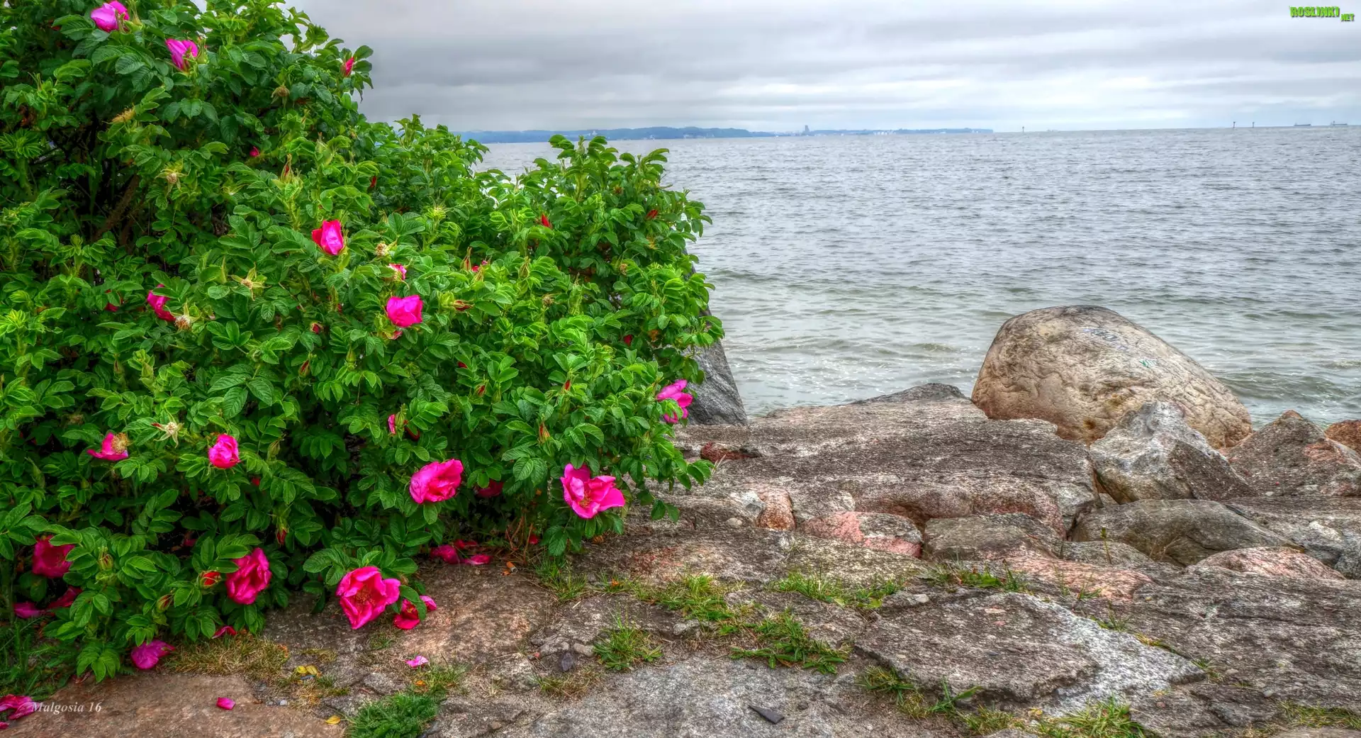 Rośliny: Morze, Woda, Kamienie, Dzika Róża, Kwiaty, HDR