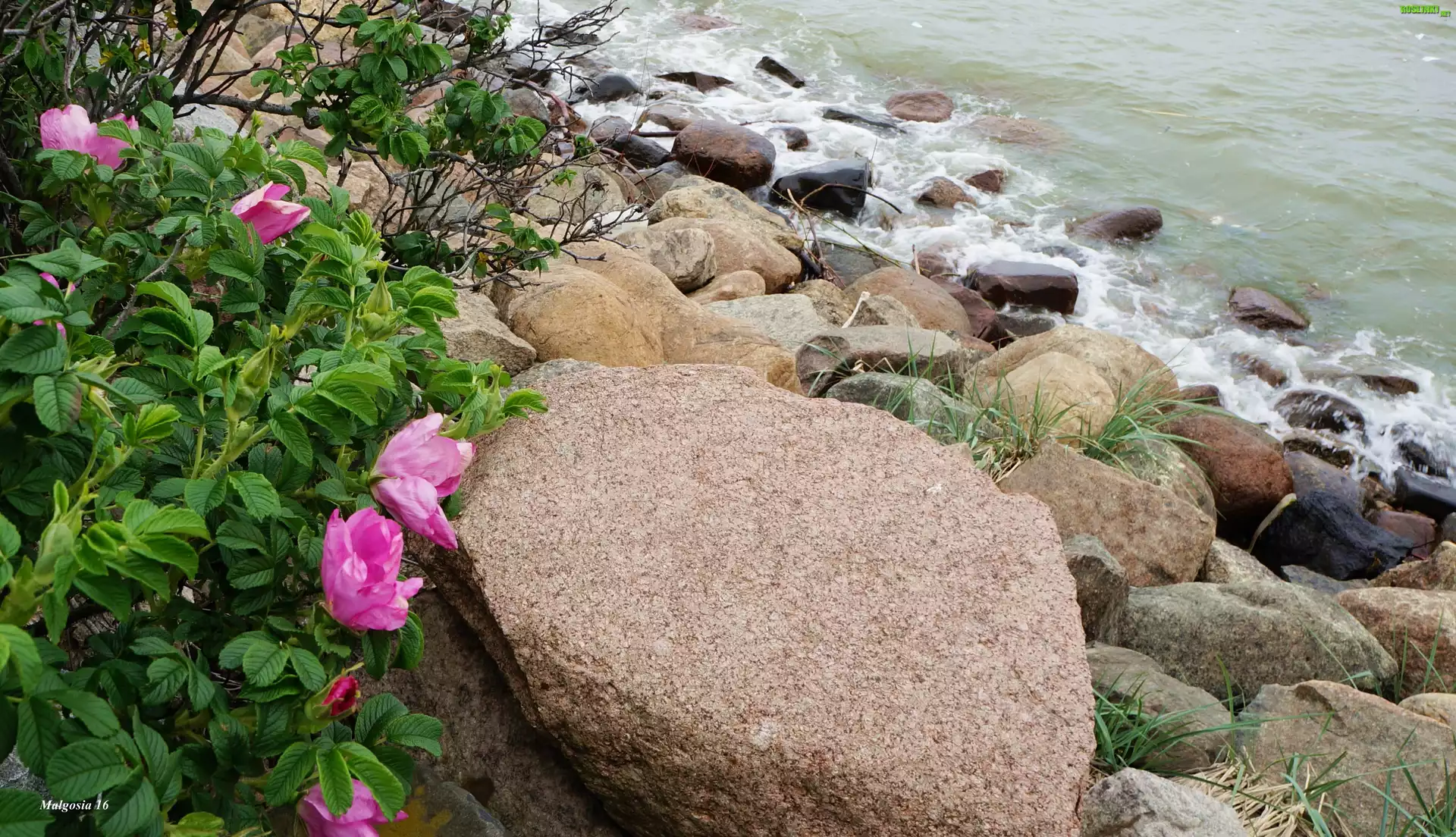 Rośliny: Morze, Woda, Fale, Kamienie, Kwiaty, Dzika Róża