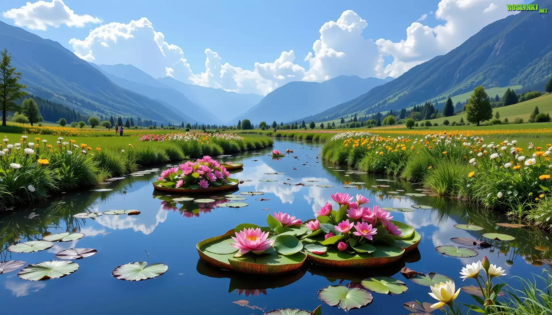 Rośliny: Rzeczka, Kwiaty, Lilie wodne, Liście, Góry
