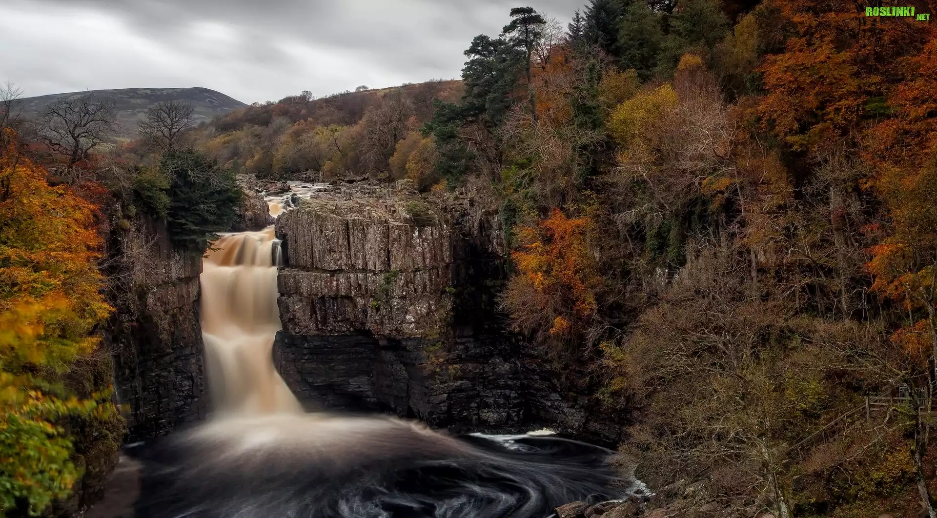 Rośliny: Anglia, Hrabstwo Durham, Rzeka Tees, Wodospad High Force, Jesień, Las, Drzewa, Skały