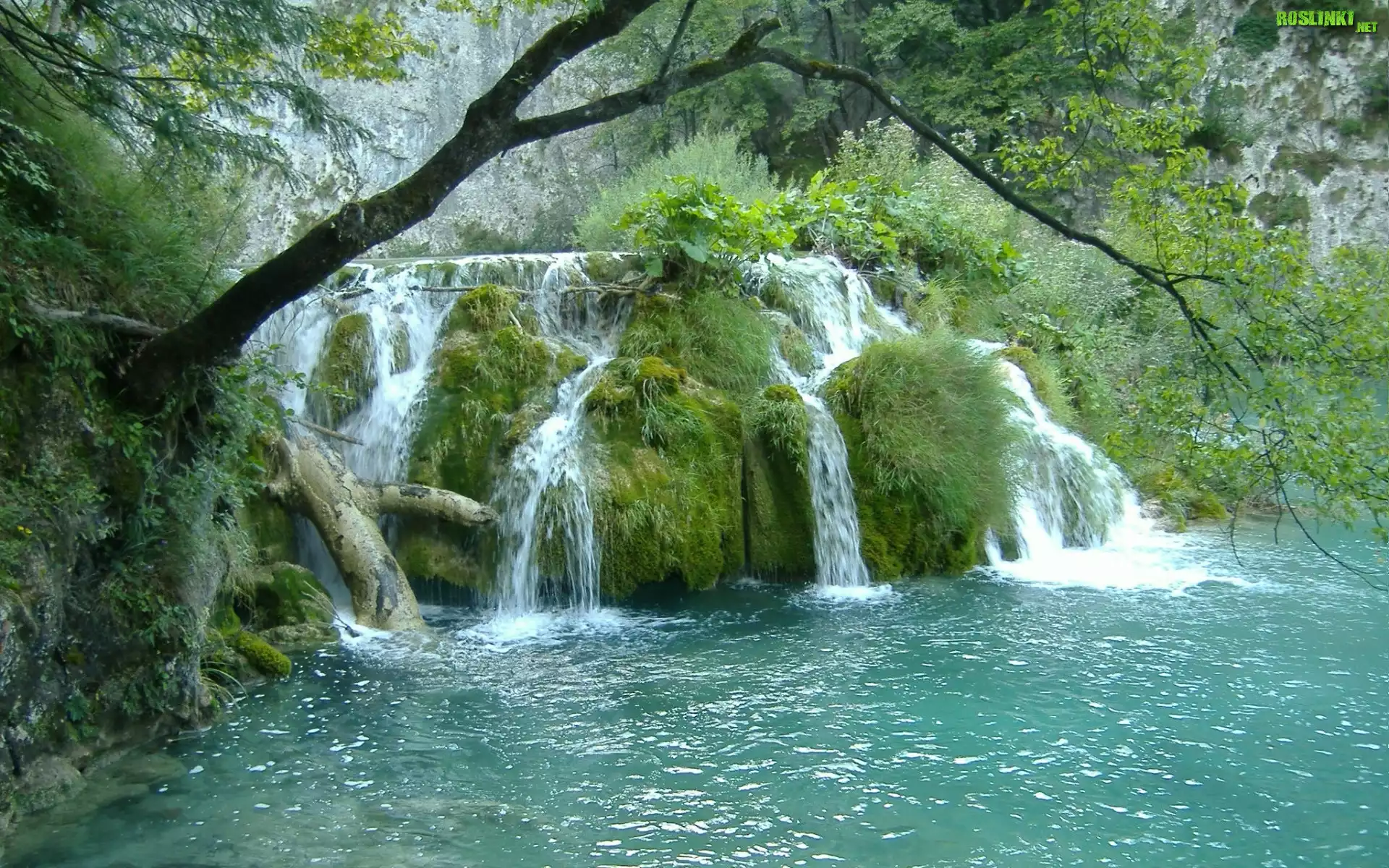 Rośliny: Wodospad, Skała, Drzewa, Krzewy