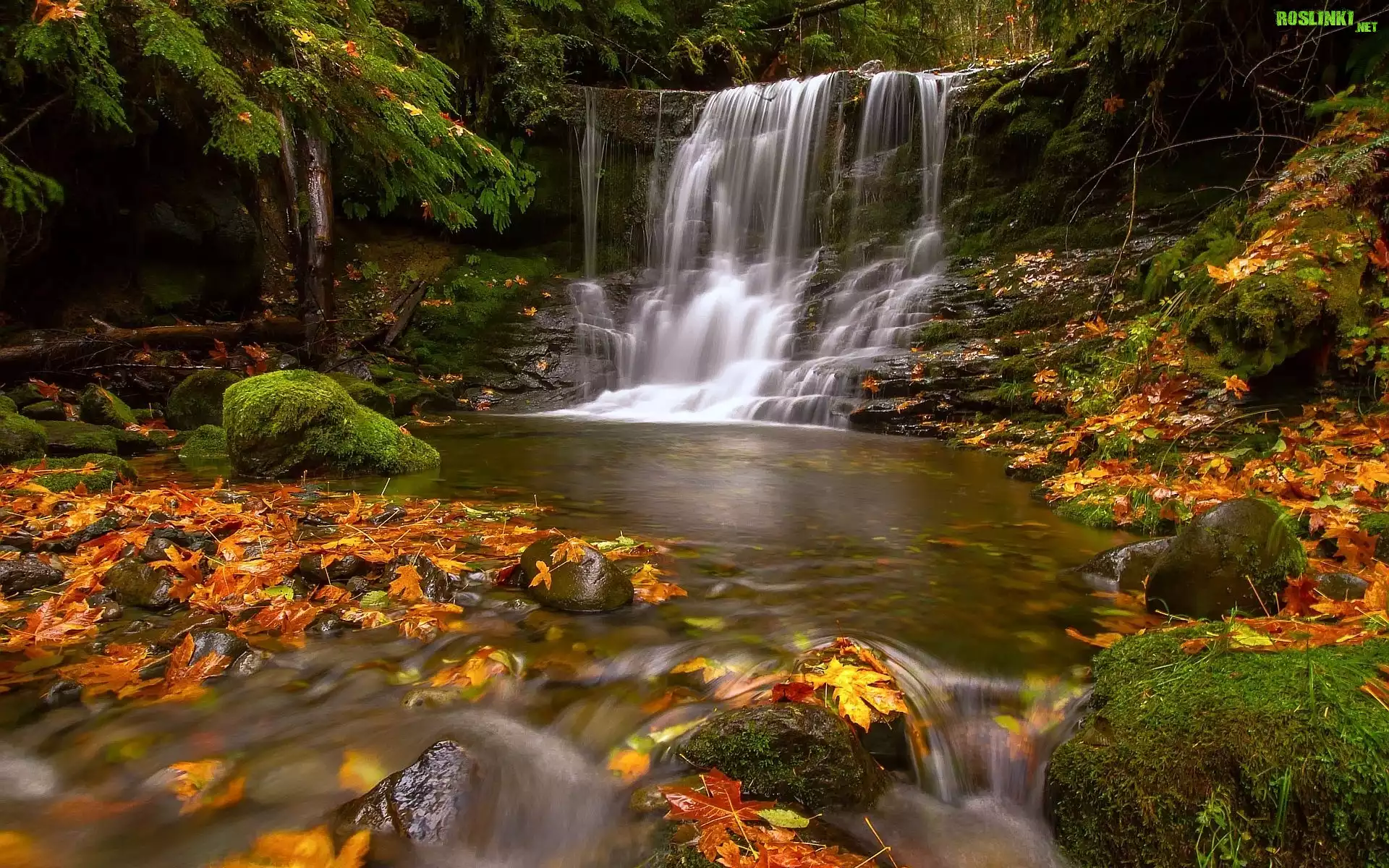 Rośliny: Wodospad, Las, Skały, Jesienne, Liście