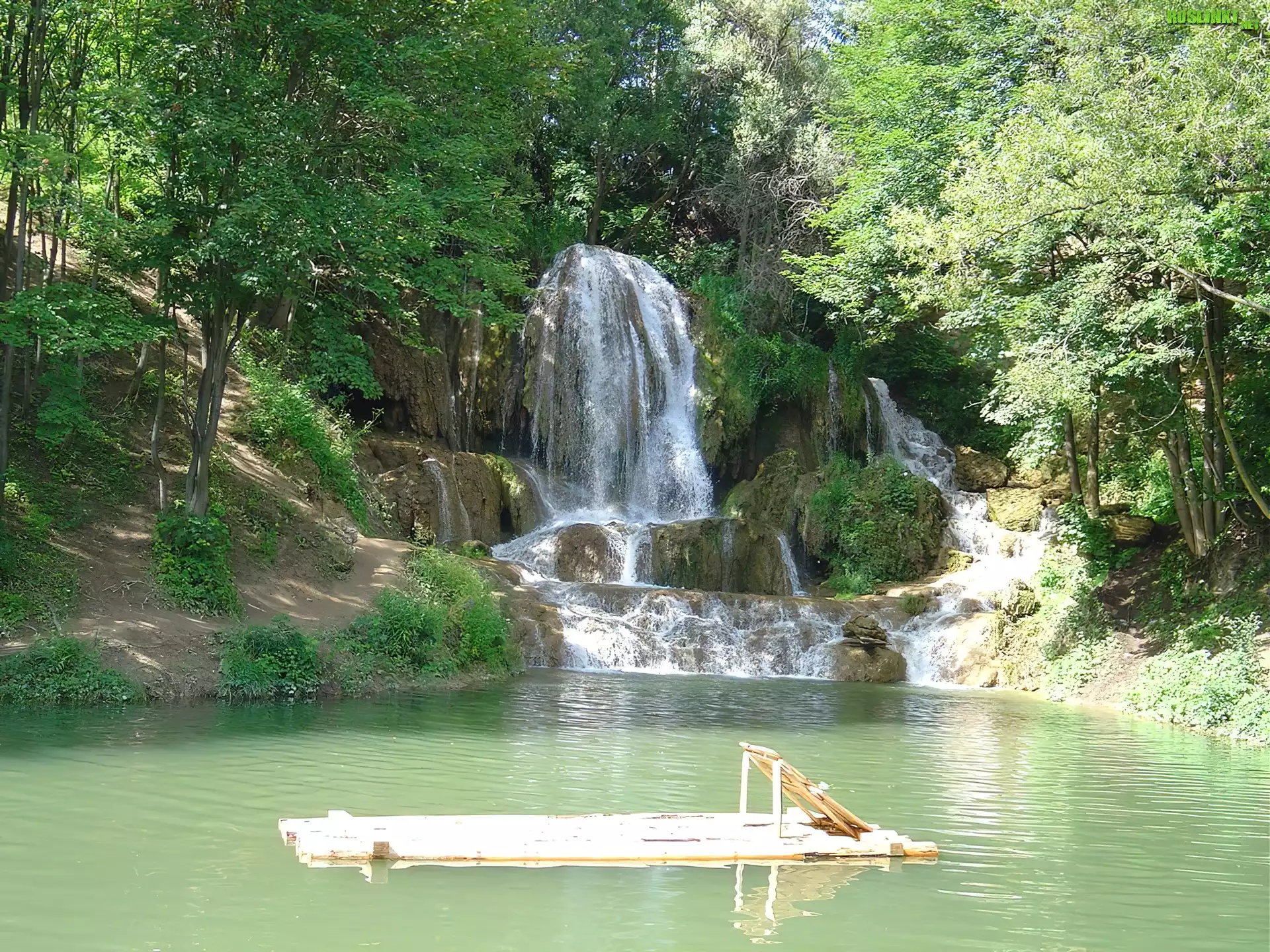 Wodospad, Drzewa, Jeziorko, Tratwa