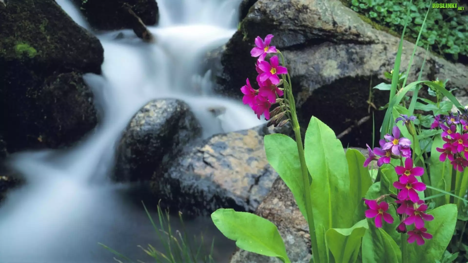 Rośliny: Wodospad, Kamienie, Różowe, Kwiaty, Rośliny