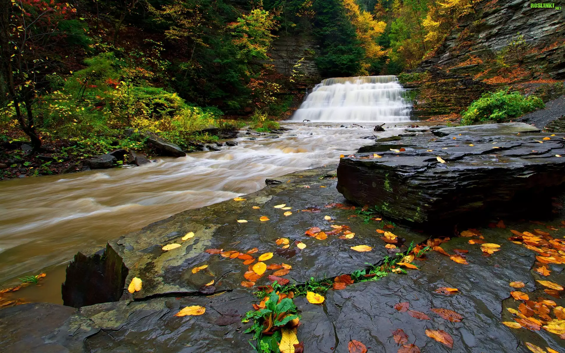 Rośliny: Wodospad, Skały, Liście, Las, Jesień