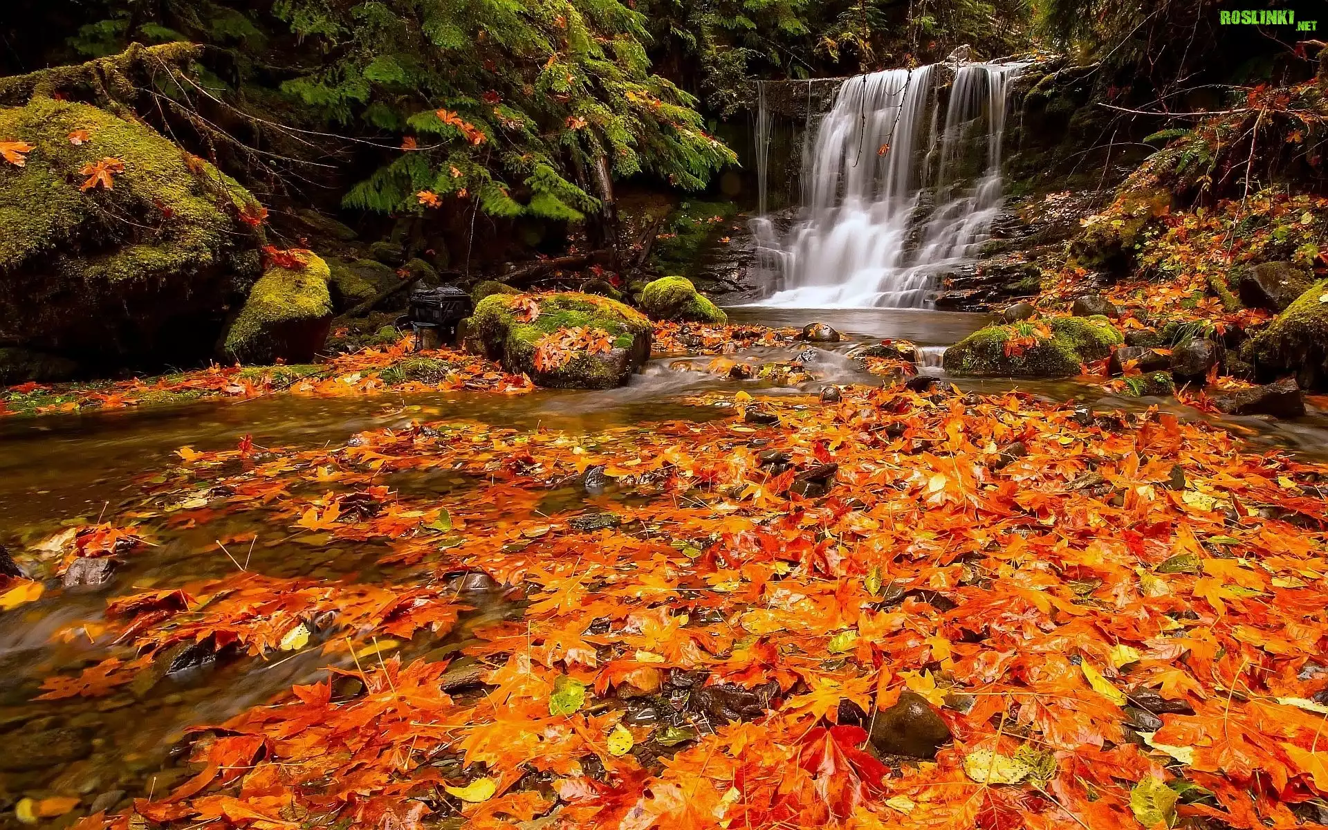 Rośliny: Wodospad, Las, Liście, Jesień