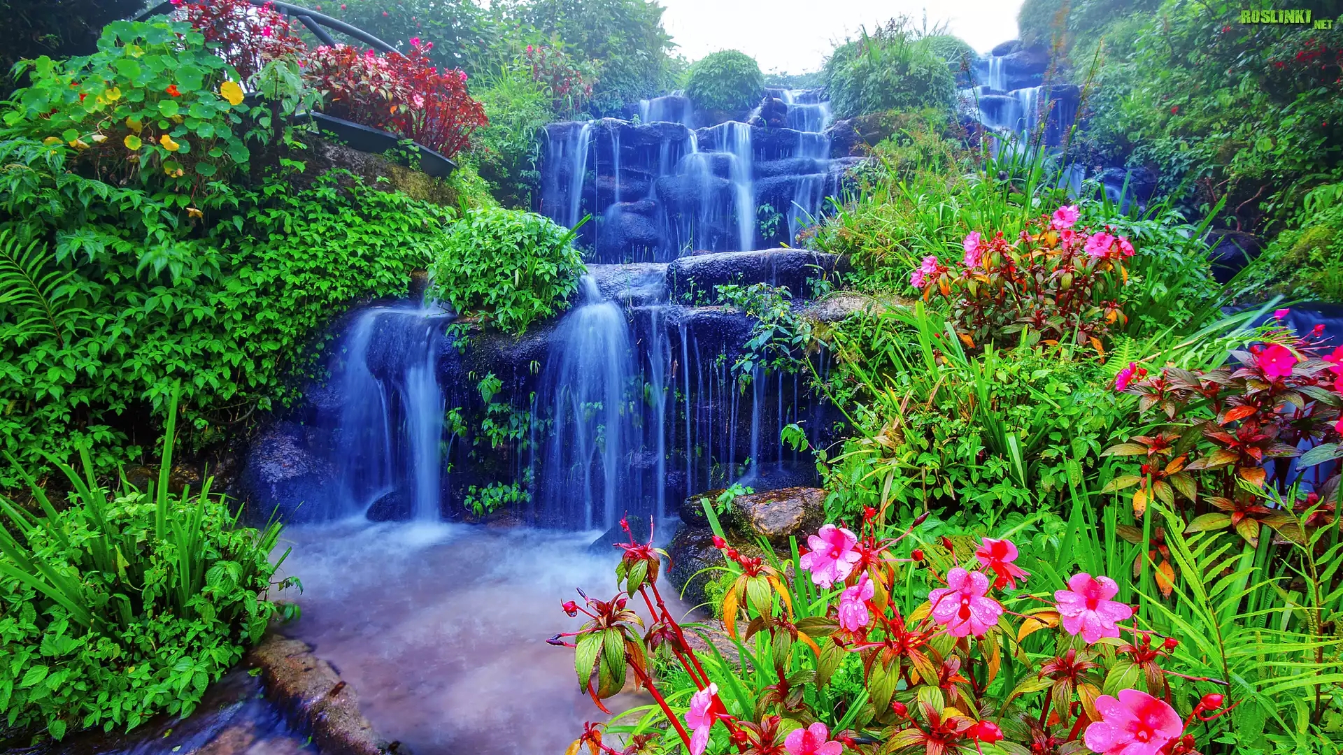 Rośliny: Wodospad, Skały, Kaskada, Kwiaty, Roślinność, Drzewa