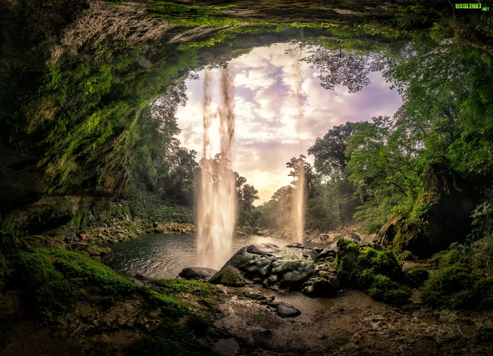 Rośliny: Wodospad, Drzewa, Skały, Jaskinia, Rybie oko
