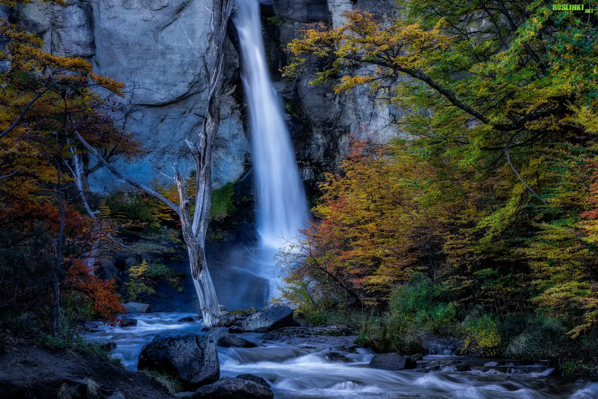 Wodospad, Chorrillo del Salto, Skała, Drzewa, Rzeka, Kamienie, Park Narodowy Los Glaciares, Argentyna |