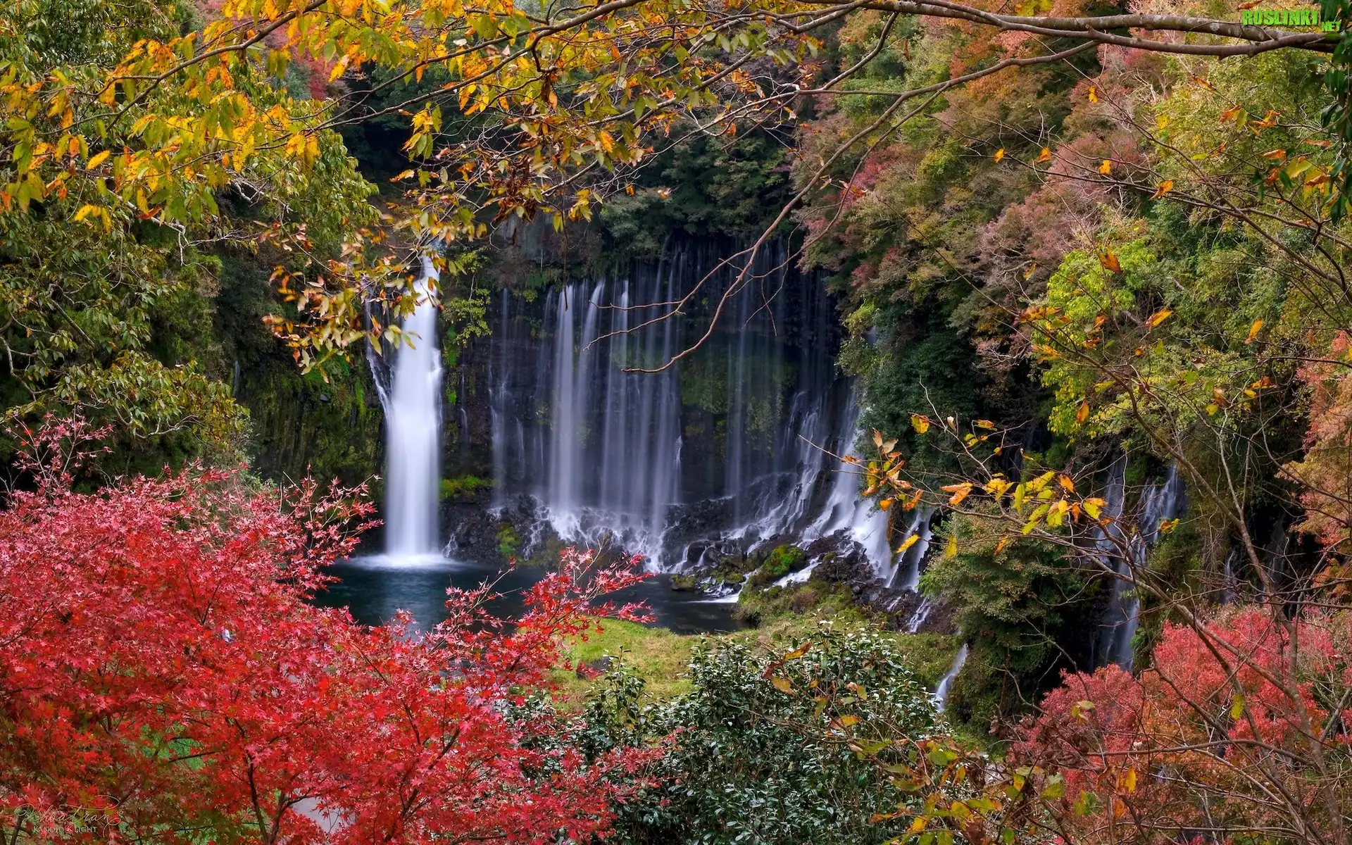 Rośliny: Wodospad, Shiraito Falls, Skały, Kolorowe, Drzewa, Jesień, Prefektura Shizuoka, Japonia