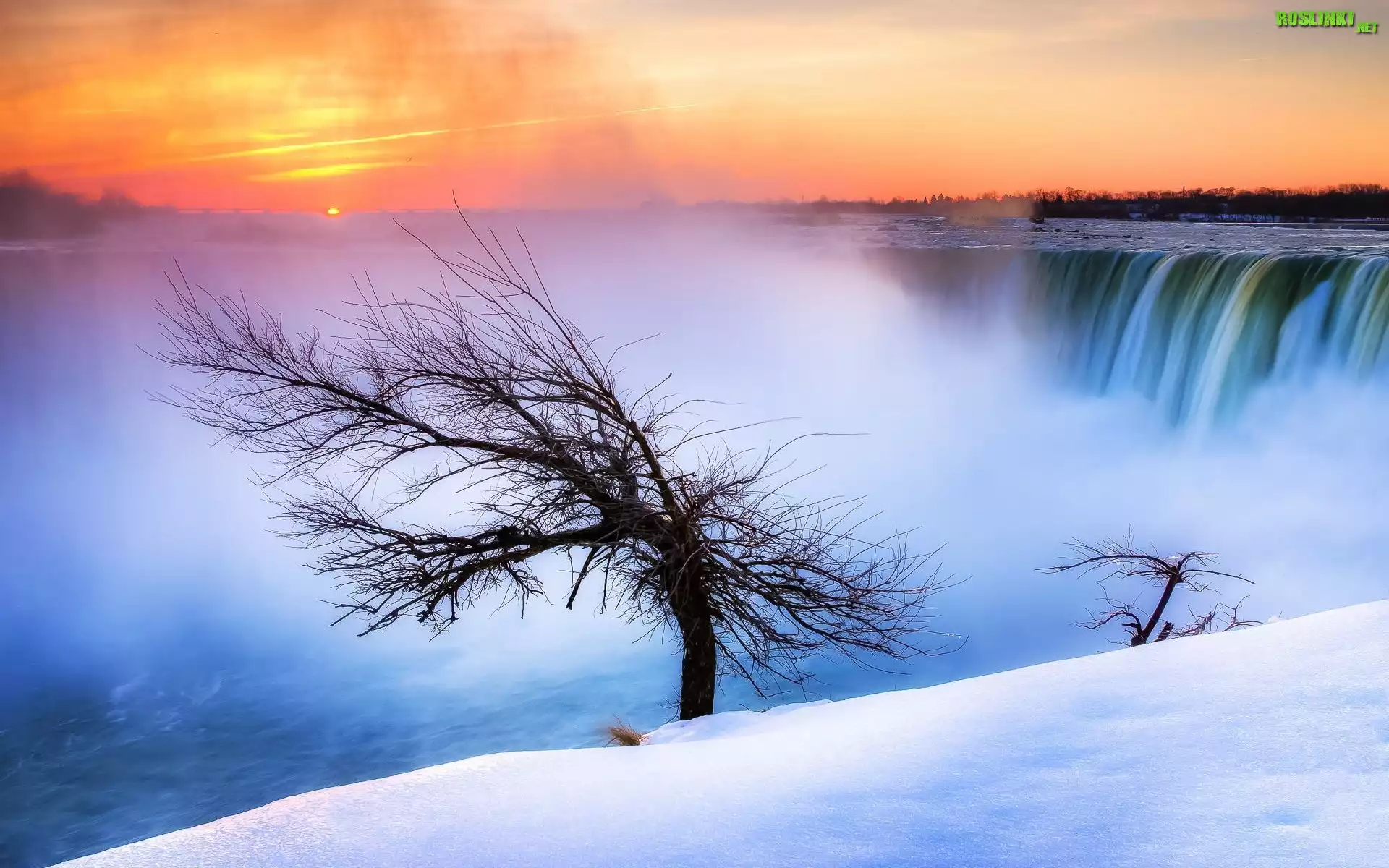 Rośliny: Wodospad, Drzewo, Wschód, Słońca, Zima