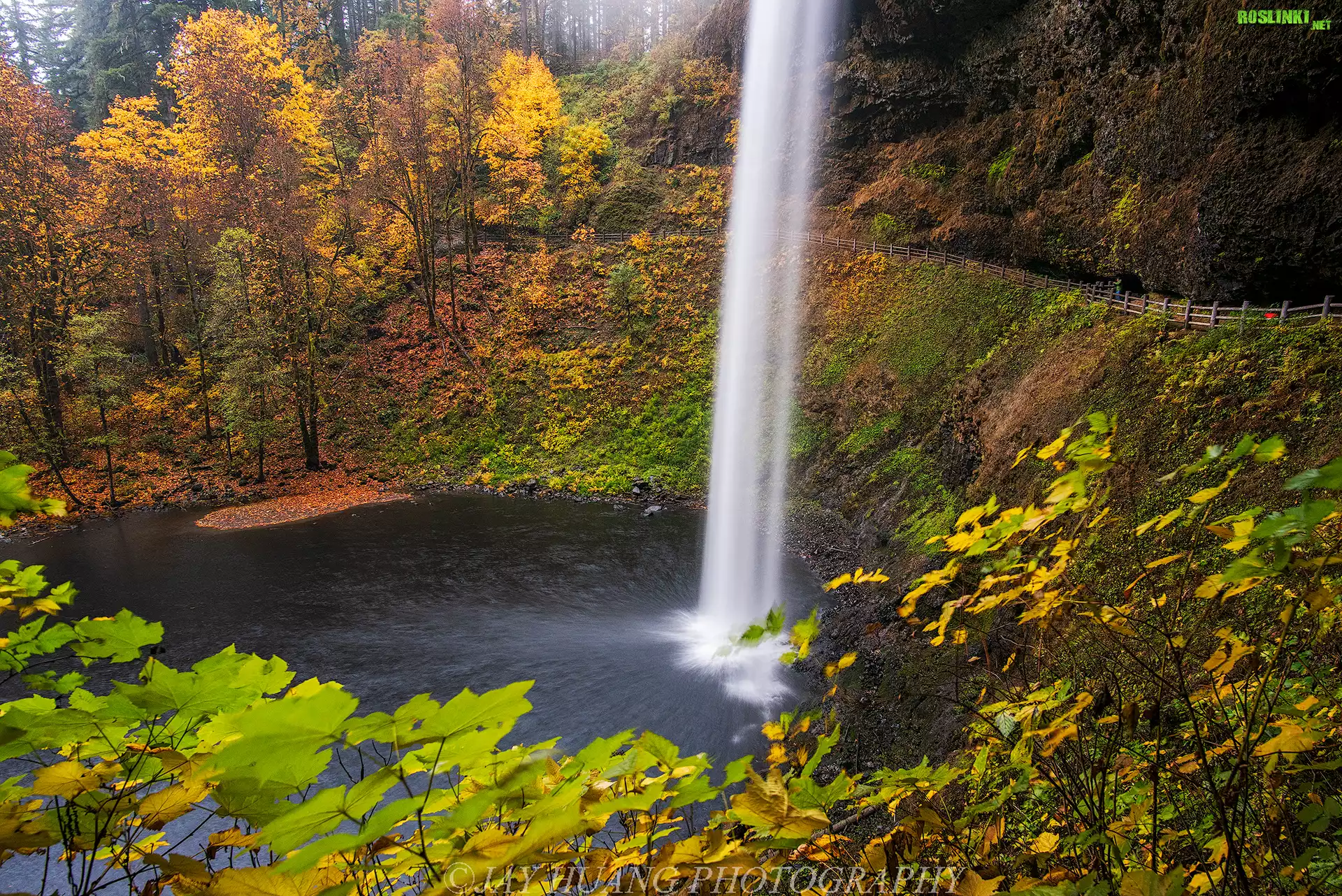 Wodospad South Falls, Las, Drzewa, Jesień, Punkt widokowy, Park miejski Silver Falls, Oregon, Stany Zjednoczone |