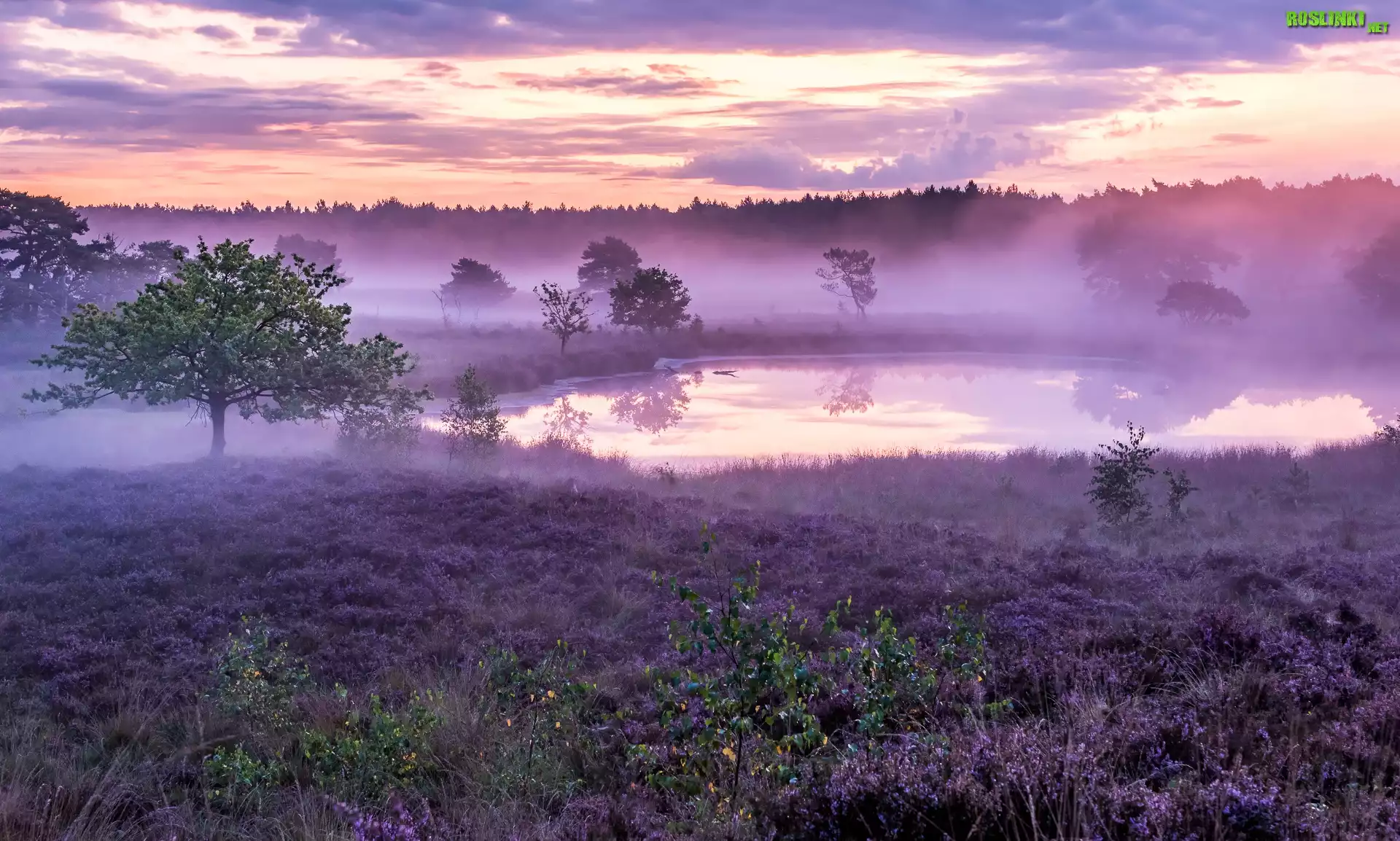 Rośliny: Wrzosowisko, Wrzosy, Staw, Mgła, Drzewa, Chmury