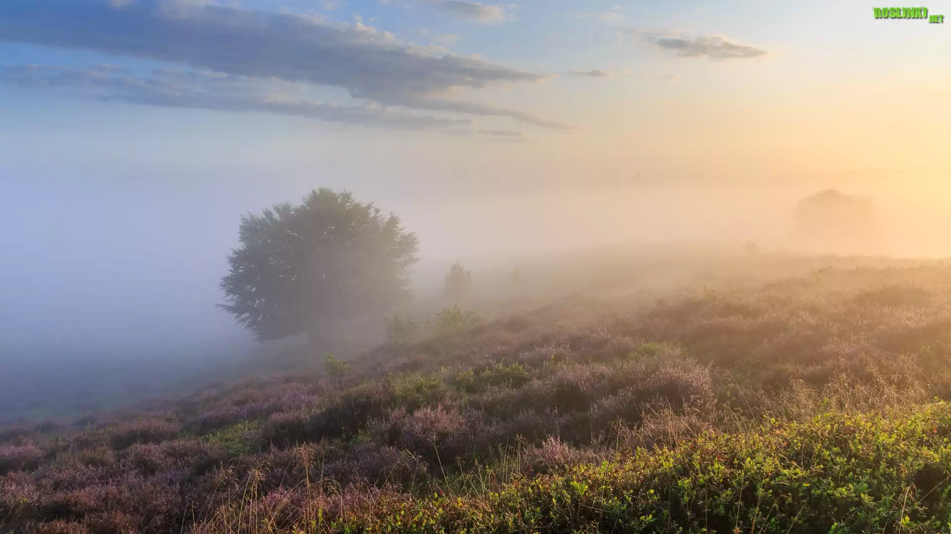 Rośliny: Wrzosy, Wrzosowisko, Mgła, Drzewo, Chmury