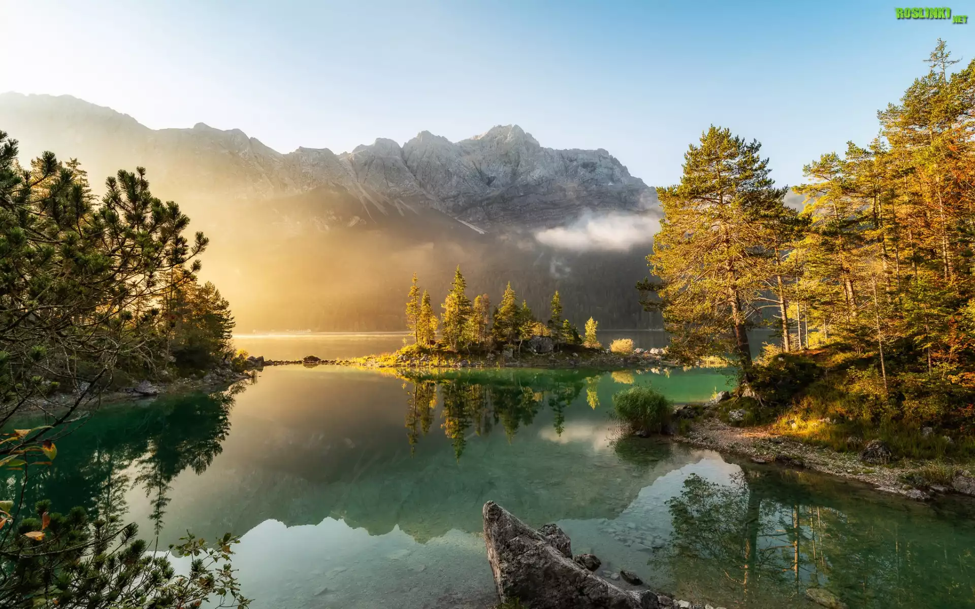 Wschód słońca, Góry, Alpy Bawarskie, Jezioro Eibsee, Wysepka, Drzewa, Mgła, Odbicie, Bawaria, Niemcy |