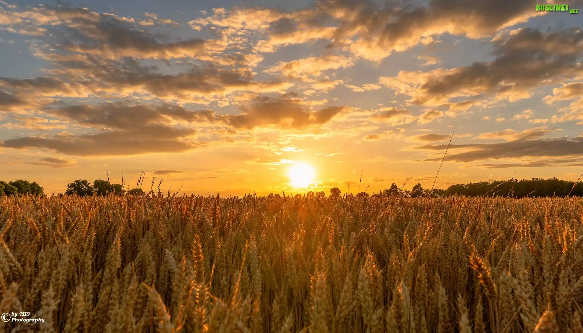 Rośliny: Pole, Zboże, Drzewa, Wschód słońca, Chmury