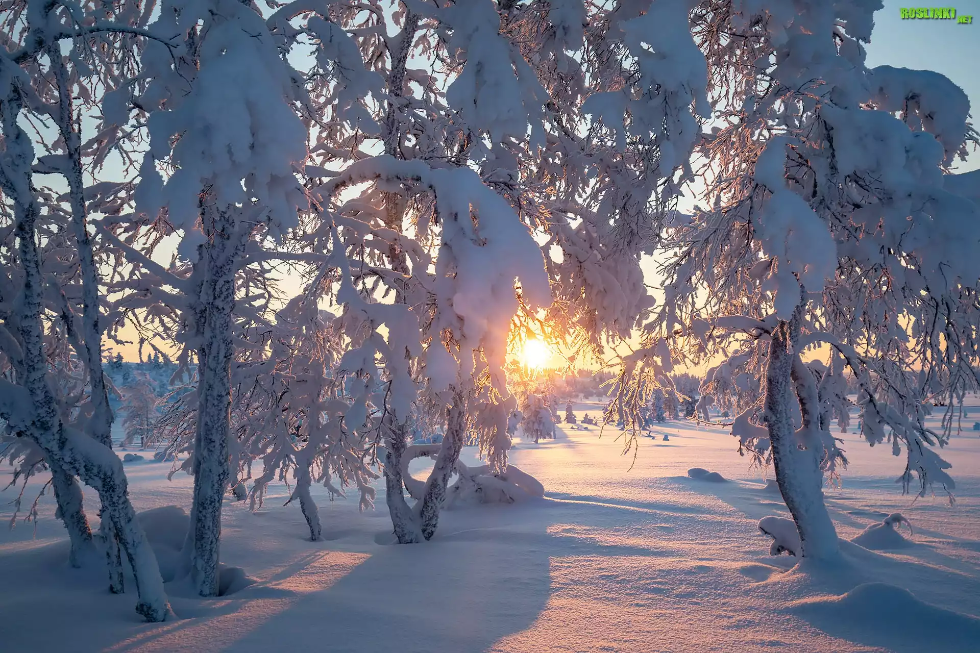 Rośliny: Wschód słońca, Ośnieżone, Drzewa, Zima